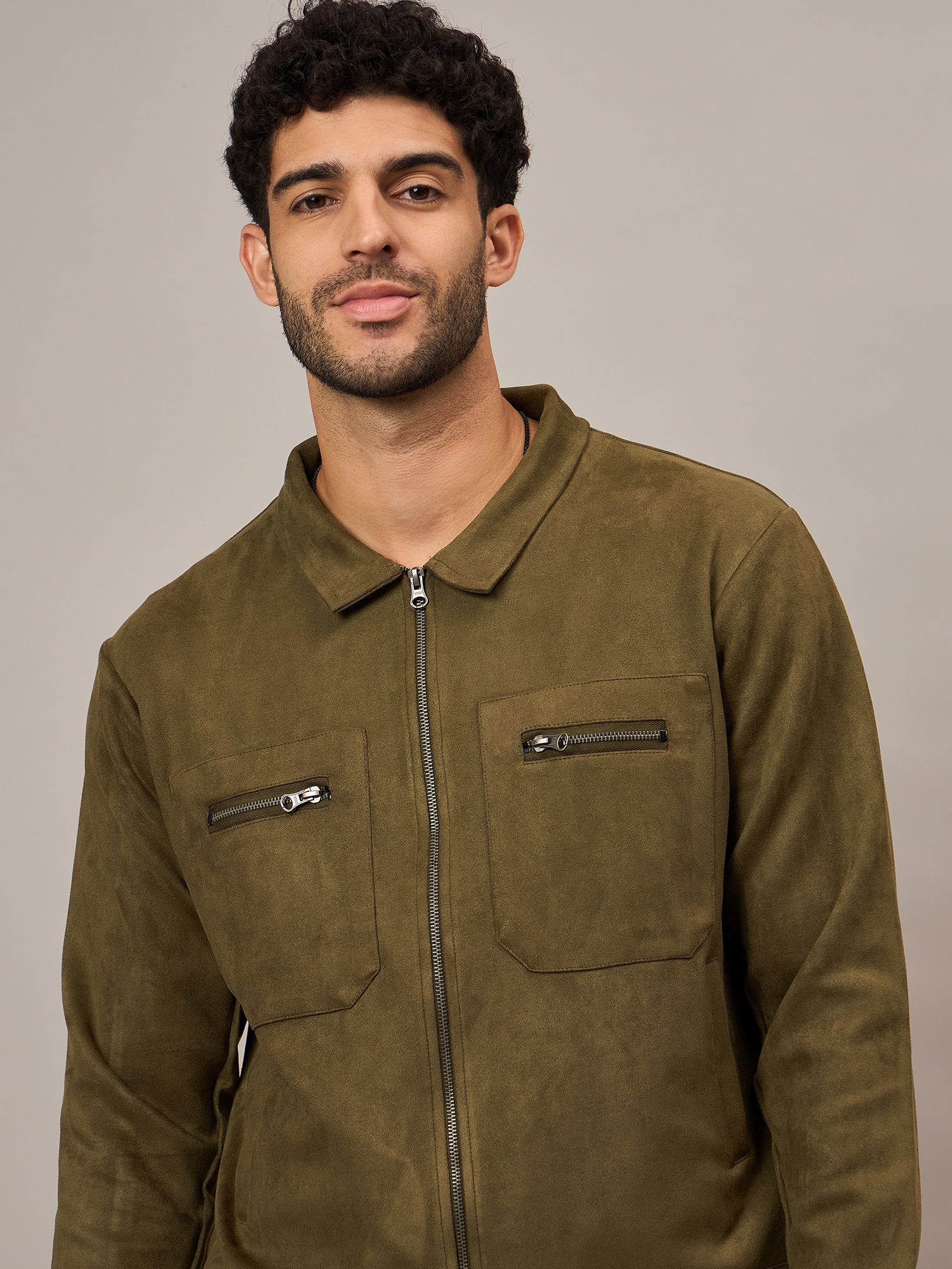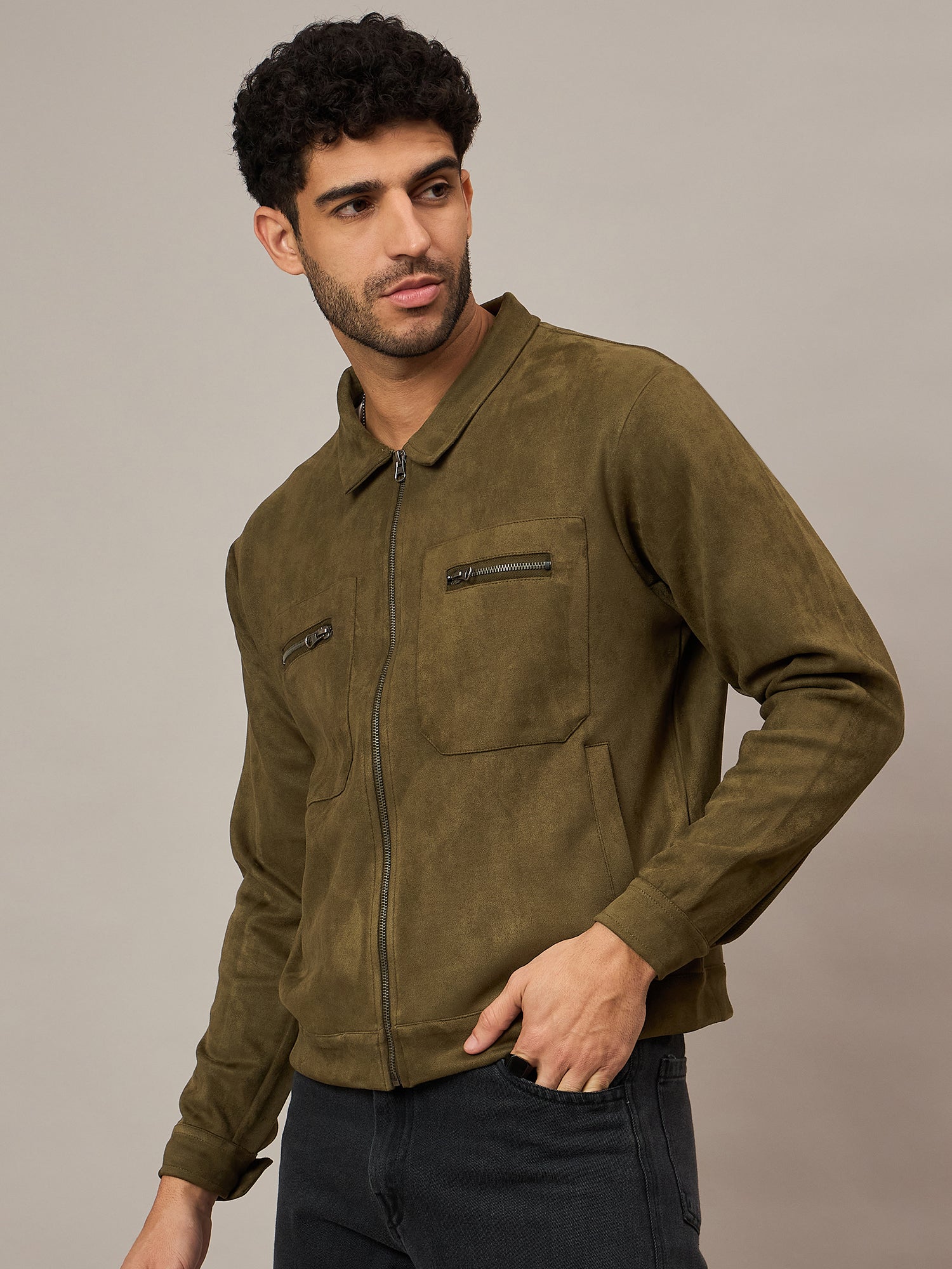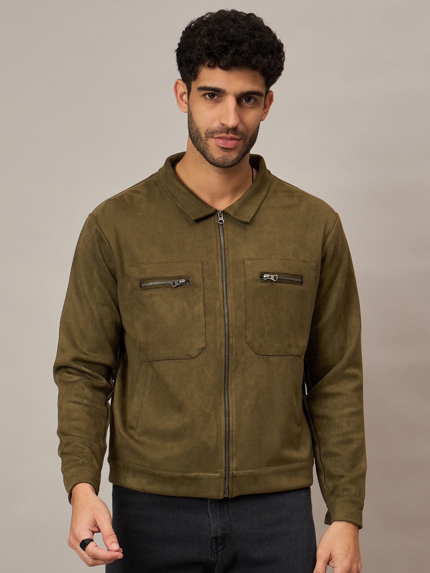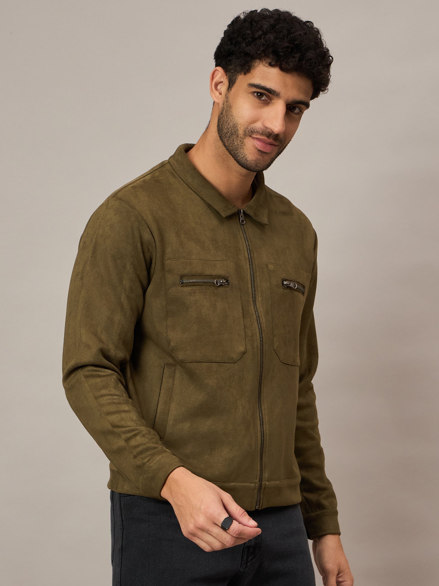 Olive Suede Pocket Zipper Jacket With Stand Collar