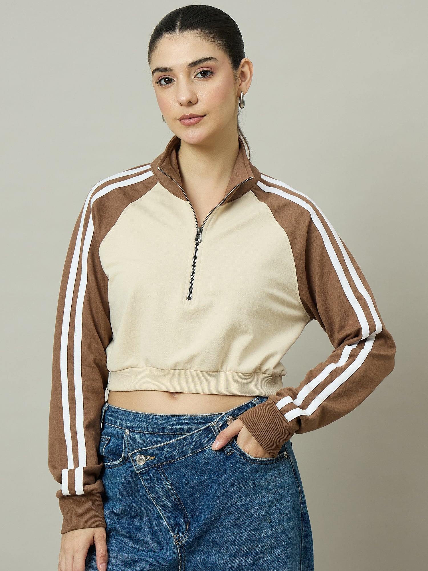 Women Brown & Beige Stand Collar Cropped Sweatshirt